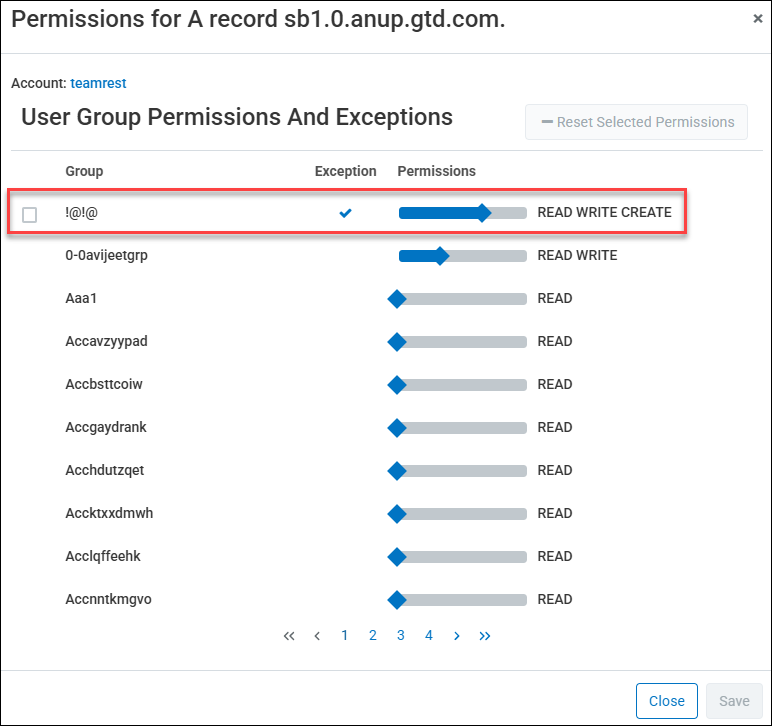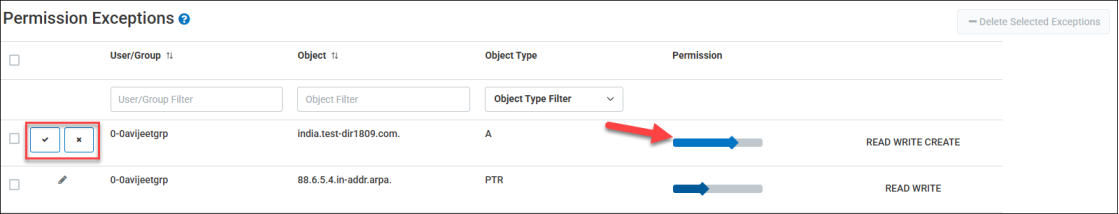 For example, you create Group A, and you set the permission level for Domain to READ WRITE, thereby allowing every user in Group A to view and edit all domains. However, there is one specific zone that you don’t want the users in Group A to be able to edit, so you create an exception for that one zone, and set the permission level to READ only.