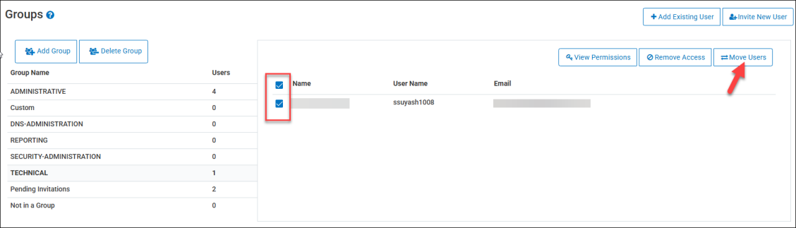 Click the Move button. The user is removed from their from the previous group, and moved to the new group.