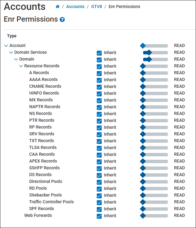 For example, if you set the permissions for Domain to Read Write Create, and then select the Inherit box for Resource Records, Resource Records will obtain Read Write Create permissions, and all of the record types that are under Resource Records will also obtain the Read Write Create permissions due to the trickle-down effect.