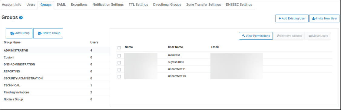 The Primary Account Owner has full administrative access and permissions for the UltraDNS UI Portal, and they will not be displayed in the Users or Groups section (nor in the Stand Alone Users section) because their permission settings cannot be restricted or altered. |