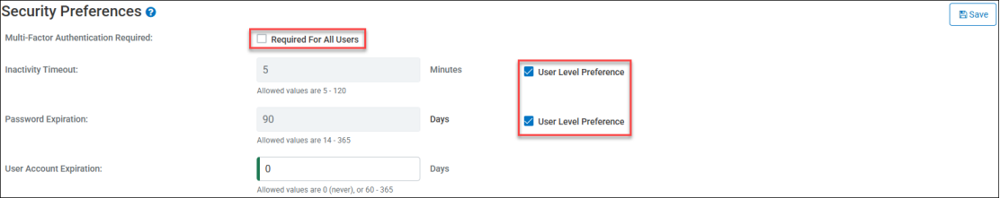To allow users to configure their own Inactivity Timeout value, check the User Level Preference checkbox, otherwise, the configured value is applied to every user in the account.