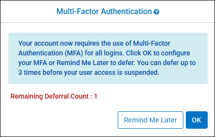 Selecting Remind Me Later defers setting up a Multi-Factor Authentication type on the account. Users that do not complete the mandatory MFA setup process after deferring 3 times will have their accounts suspended.