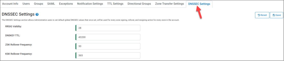 The DNSSEC Settings section allows Administrative users to set default global DNSSEC values that once set, will be used for every zone signing, rollover, and resigning action for every zone in the account.