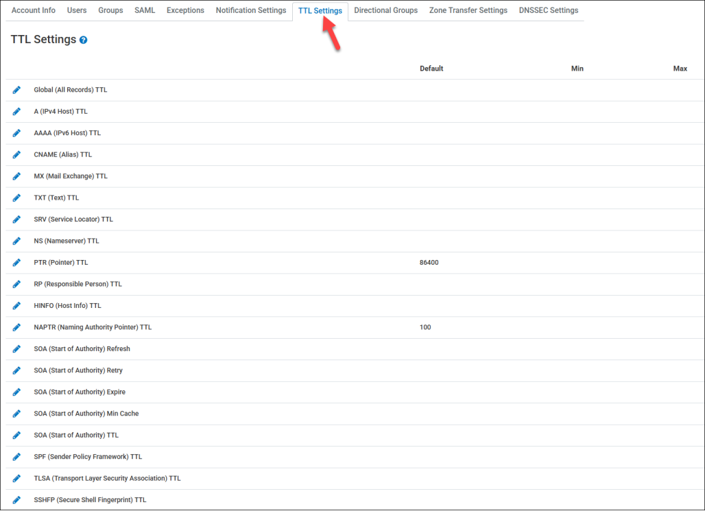The TTL (Time To Live ) Settings displays the configured TTL settings for records in the account by displaying the Default, Min (minimum), and Max (maximum) values. If you have the necessary privileges, you can configure individual record settings.