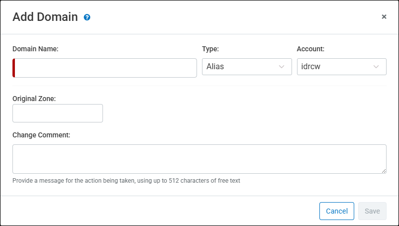 To create an Alias domain, change the Type drop-down menu to Alias, and then complete the Original Zone name field and click Save.