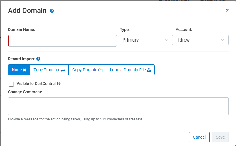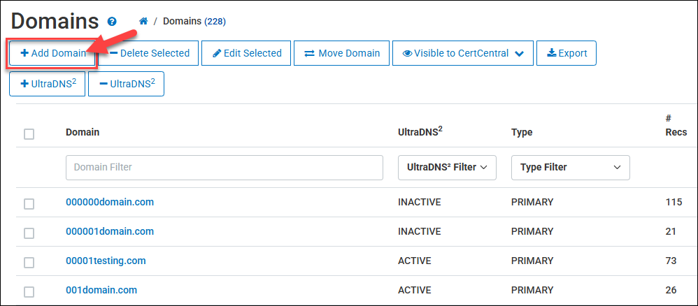 If you have enabled the DigiCert CertCentral Connection feature, you can check the box to here to automatically make the domain Visible to CertCentral once it’s created.