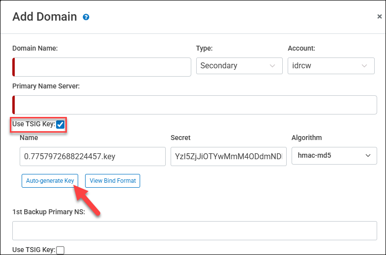 Secondary domains provide the capability to use TSIG keys as an additional layer of security for your Name Server, as well as the Backup Name Server(s) if you choose to add them. The TSIG Key value can either be entered manually, or you can select the Auto-Generate Key button to have a randomly generated TSIG Key created for you.