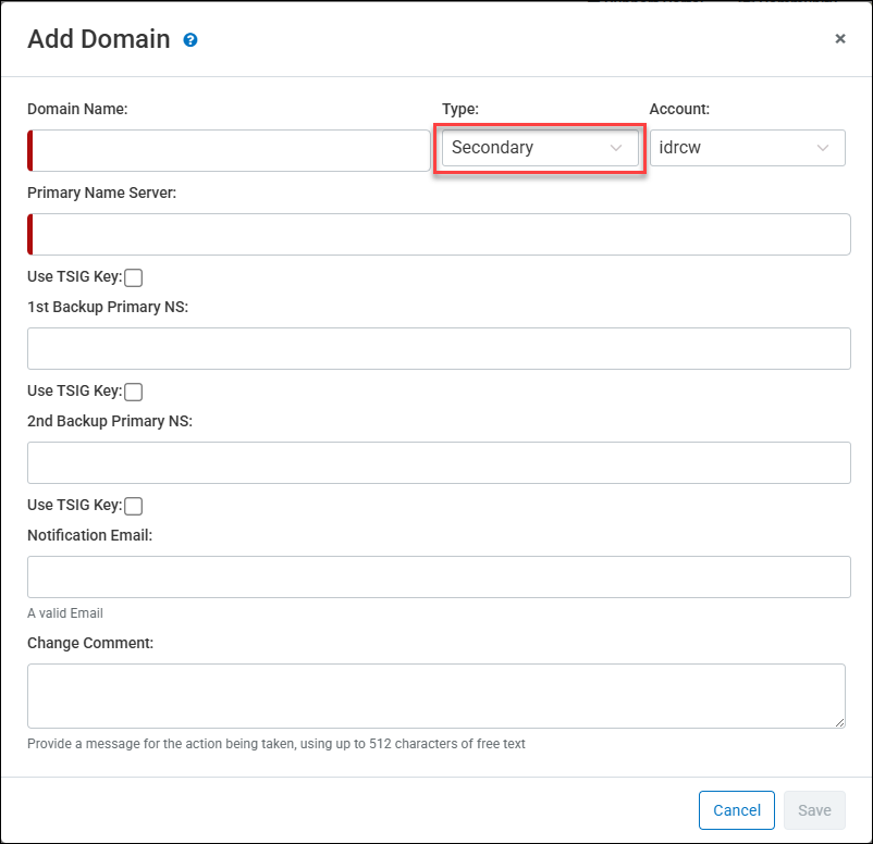 If you are creating a new secondary domain, or editing an existing one, any changes made to the TSIG Key values requires you to Save the changes before they can go into effect. Updating the TSIG Key and collecting the details from the BIND file without clicking the Save button results in invalid information. |