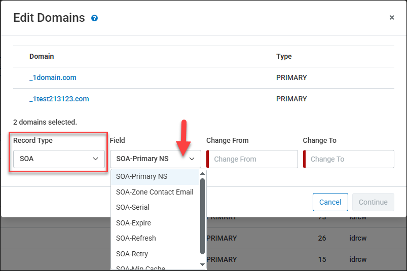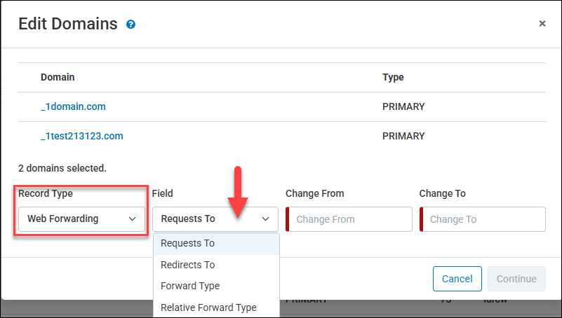 Field - Points To - Indicates that the IPv4 address will be changed for the A records in the selected domains.