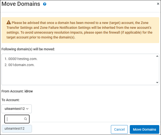 Review the domains that you have selected, and then select the Account name from the drop-down menu that you want to move the zones to.