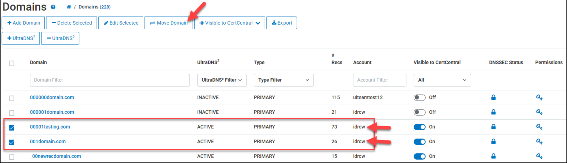 Select the checkmark next to a domain, or multiple domains that you want to move to a new account.