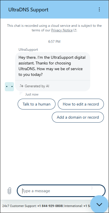 On the UltraDNS Managed Services Portal, the chat icon is displayed in the bottom right-hand corner. Once you open the chat you can begin asking your questions, or immediately click the option to speak to an agent.