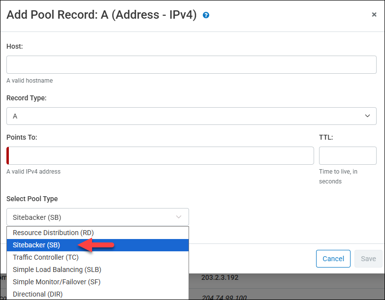 Record Type - The available record types can include A, AAAA, SB (SiteBacker) / TC (Traffic Controller), or CNAME.