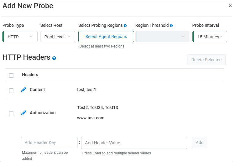 Configuring HTTP Probe Headers allows you to tailor monitoring to your specific needs and allows you to test server configurations for accurate results and mimic real user traffic to improve monitoring accuracy. Probe Headers consist of a key:value pair, and each Probe can only consist of 5 configured headers.