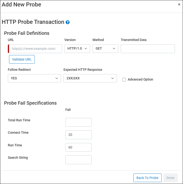 URL – The URL that is being probed. You can select the Validate URL button to ensure the URL you are attempting to probe is a valid URL that can be reached.