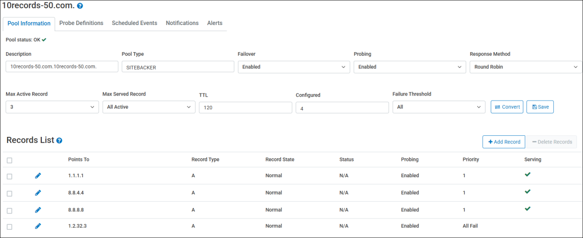 Serving - Signifies if the record is Available to Serve or not (meaning if a probe was successful or not). A check mark indicates that serving is available, while a X indicates it is not.