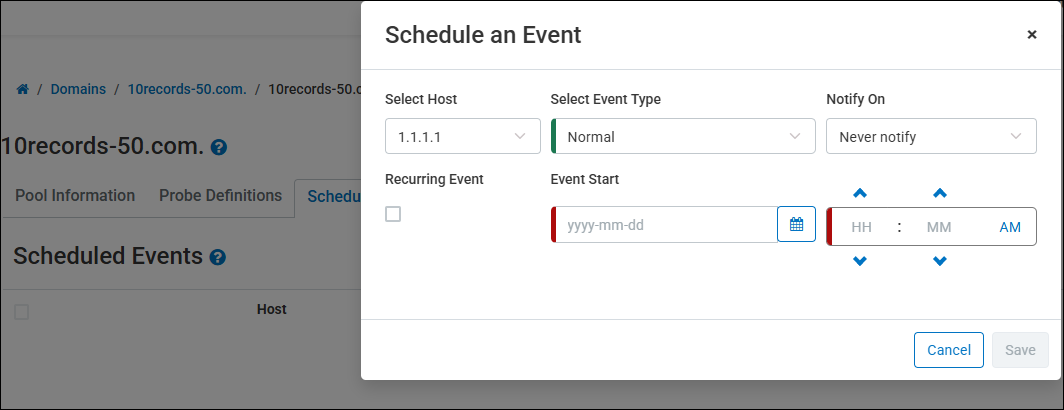 The Scheduled Events tab lists any upcoming events for your pool records. For example, you can schedule an event to test the failover functionality of your pool.