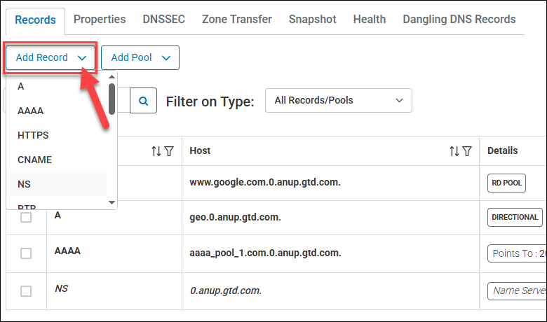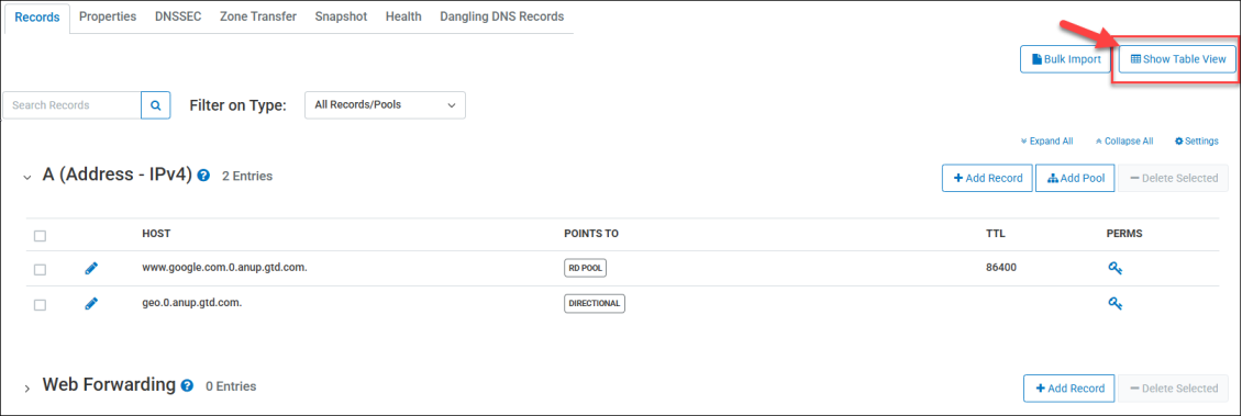 The Table View provides users with a more compact and streamlined view of the records within their Domain. Instead of every record type that is supported being displayed, the Table View only displays those records and/or Pools that have been configured on your Account.