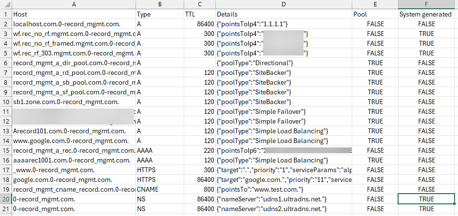 | System Generated | Displays a True/False indicator if the record was created manually or generated by the UltraDNS system. This will most commonly identify the Name Server (NS) records. |