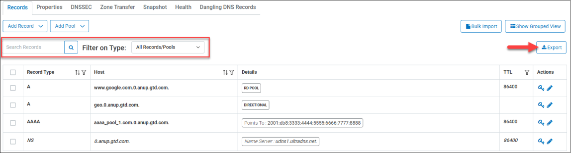 When viewing records using the Table View, you have the option to Export your domain’s record details. You can use the filtering options to narrow down your records or export every record in the domain to a .CSV file.