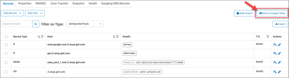 The Grouped View is the standard view that users are most commonly familiar with. Each Record type can easily be expanded or collapsed to streamline your viewing experience. Additionally, you can click the Add Record, or Add Pool next to record type, without needing to expand a record section.