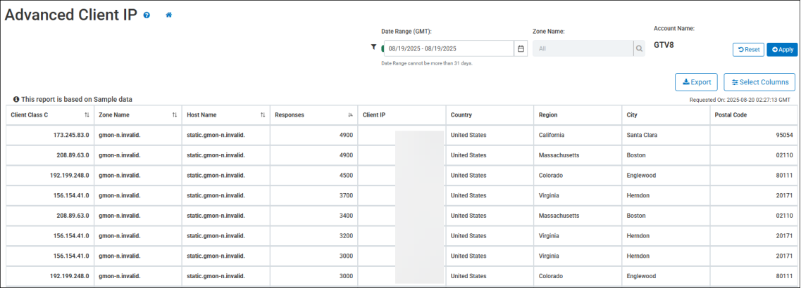 The Advanced Client IP Report displays the number of responses sent to Class C networks. Reporting time-frames are returned using the GMT time zone.