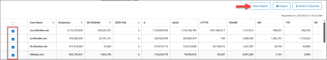 Clicking in the checkbox next to a Zone Name will enable the Host Report button, which will display the Host Query Volume Report Details report for the selected zone.