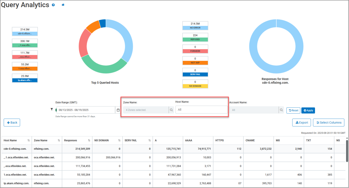 The Query Analytics Report page is comprised of two reports: the Zone Query Details Report, and the Host Query Volume Report. Reporting time-frames are returned using the GMT time zone.
