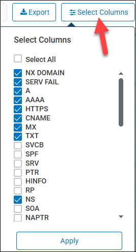 The Select Columns button allows you to configure the columns of data that are displayed in the table. The Responses column cannot be removed from the list, but the list of additional data types can be customized. If more than eight columns are selected, a horizontal slide bar will appear at the bottom of the table and allow you to view the additional columns you selected.