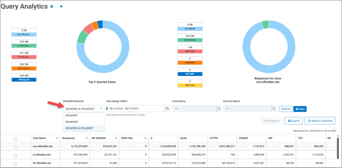 Please note that when selecting UltraDNS & UltraDNS2 as the drop-down option, the displayed report data will not indicate which zone is the UltraDNS, and which is UltraDNS2. We recommend one of two options as a workaround.
