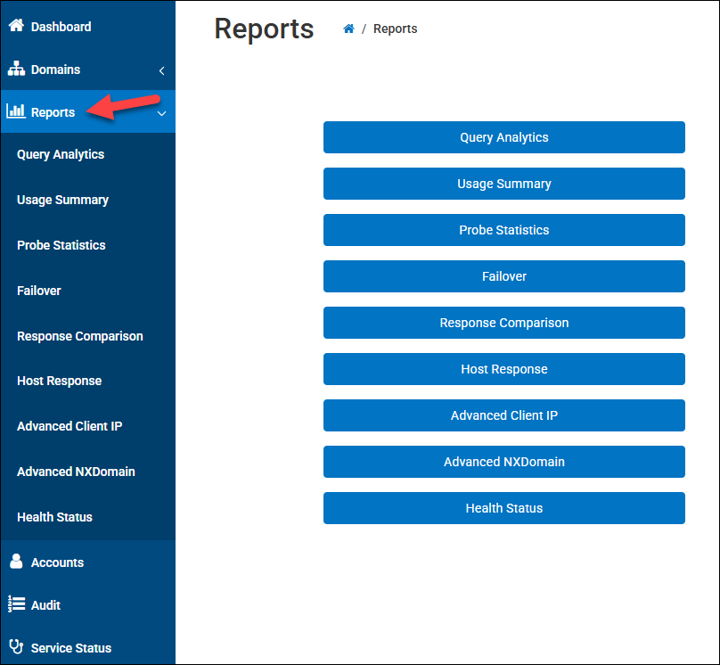 Please note, that the Advanced Reports, and the Host Response Report will not be visible for those users/accounts that have not enrolled in the Advanced Reporting feature on the UltraDNS Managed Services Portal. This optional service provides additional reports, and reporting details to customers.