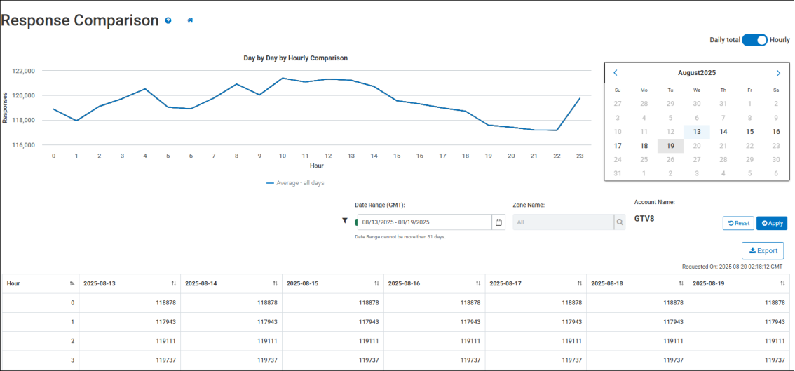 The Response Comparison Report provides two views for the Zone Responses for an Account: a consolidated Daily Total display, and an Hourly display. The responses for the previous 7 days for a selected account are displayed by default. You can hover over the chart details to view specific details for a selected date, or you can reference the table underneath the chart for additional details about the zone responses. Reporting time-frames are returned using the GMT time zone.