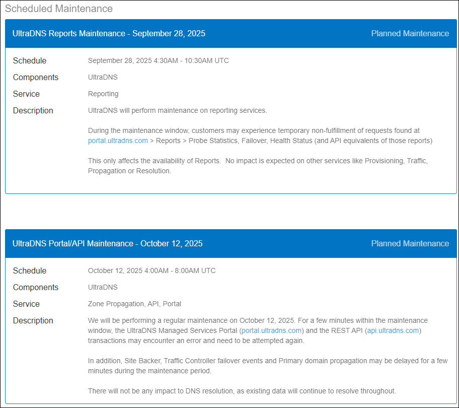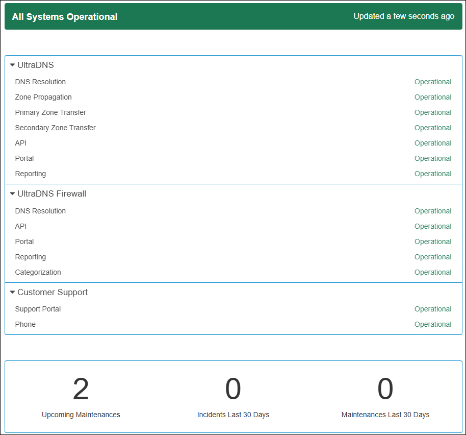 The Service Status Dashboard displays the current service availability (status) for the various Ultra (UltraDNS) service offerings. Click on the link https://status.ultradns.com/ to be directed to the UltraDNS System Status page, which utilizing the third party provider “status.io” is continuously updated with the most current information for service availability.